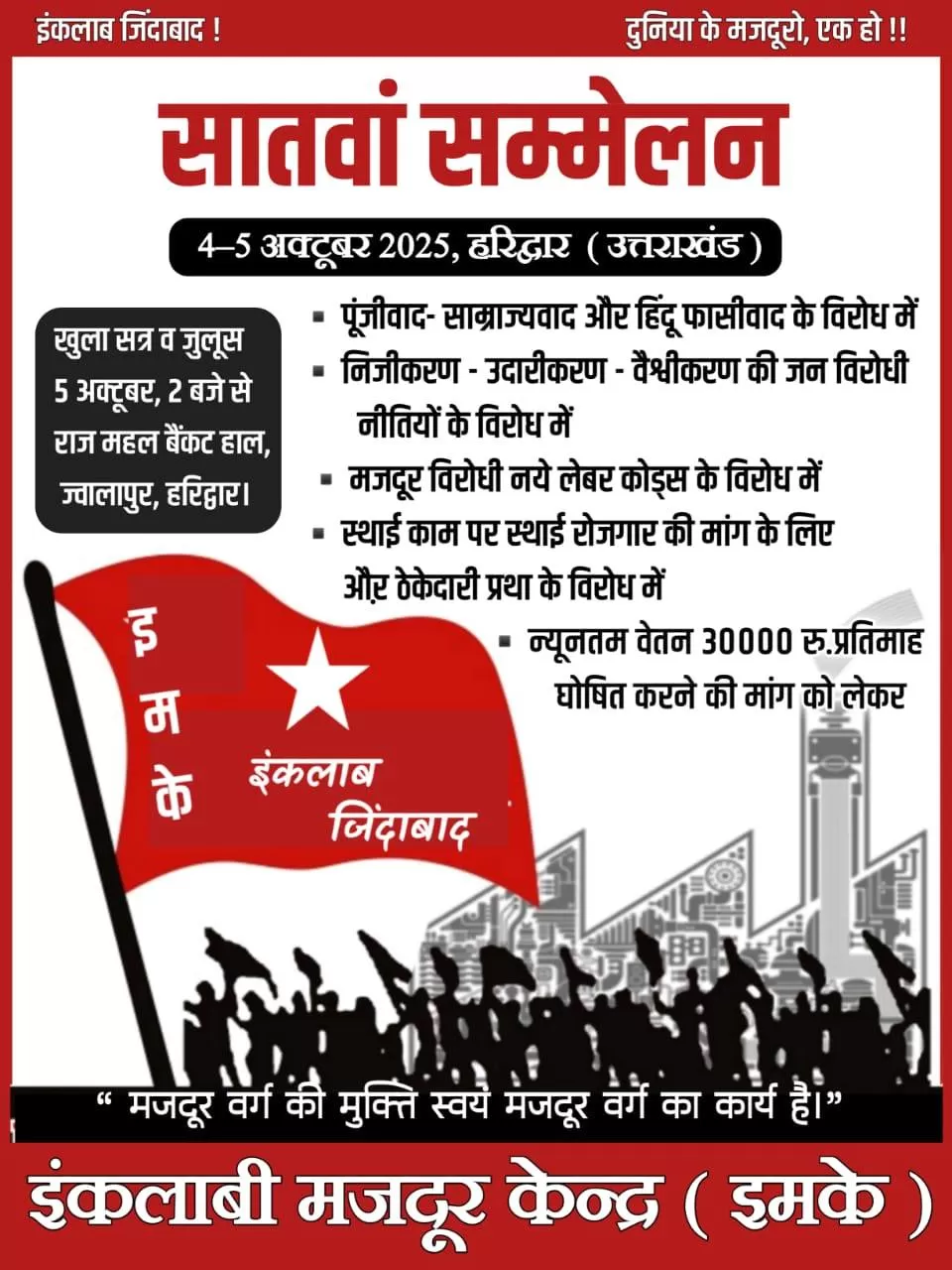 4-5 अक्टूबर को हरिद्वार में आयोजित सातवें केंद्रीय सम्मेलन में उत्तर प्रदेश के मऊ, बलिया और बरेली, उत्तराखंड के लालकुआं, पंतनगर, रुद्रपुर, काशीपुर, रामनगर और हरिद्वार, हरियाणा के गुड़गांव और फरीदाबाद एवं दिल्ली से प्रतिनिधि भागीदारी करेंगे। 5 अक्टूबर को दोपहर दो बजे से आयोजित खुले सत्र को विभिन्न मज़दूर व सामाजिक संगठनों एवं ट्रेड यूनियनों के प्रतिनिधि सम्बोधित करेंगे।